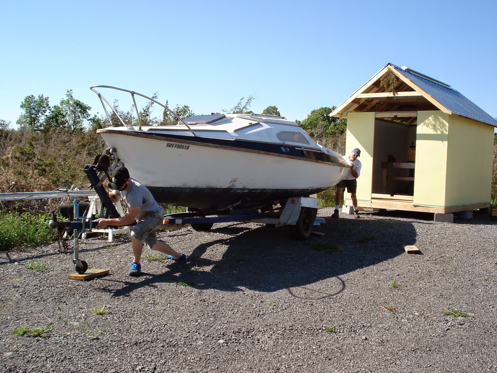 Paint shed, ask son-in-law to help move boat forward so we can build the front door. That's Chris Moizer, pulling a couple of tonnes.